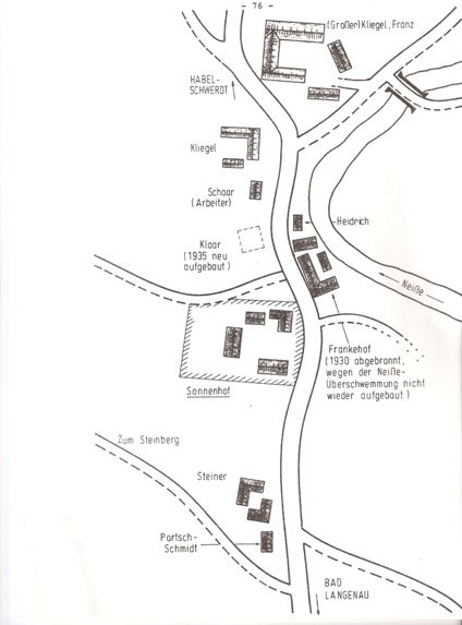 Der Hof lag an der Glatzer Neisse in Niederlangenau, ungefaehr 3 Kilometer suedlich von Habelschwerdt, und wurde mehr oder weniger regelmaessig im Fruehjahr, waehrend der Schneeschmelze, von der aus den Ufern tretenden Glatzer Neisse ueberschwemmt. Hofbesitzer waren meine Grosseltern vaeterlicherseits. Nach dem Tod meines Grossvaters wurde der Hof von meiner Grossmutter and meinem Vater sowie seinen Geschwistern bewirtschaftet. 1930 brannte der Frankehof, aufgrund von Blitzeinschlag, auf seine Grundmauern nieder. Unter Beruecksichtigung der regelmaessigen Ueberschwemmungen entschied man sich, die Gebaeude nicht wieder aufzubauen, und damit endete die Existenz des Frankehofes in Schlesien.